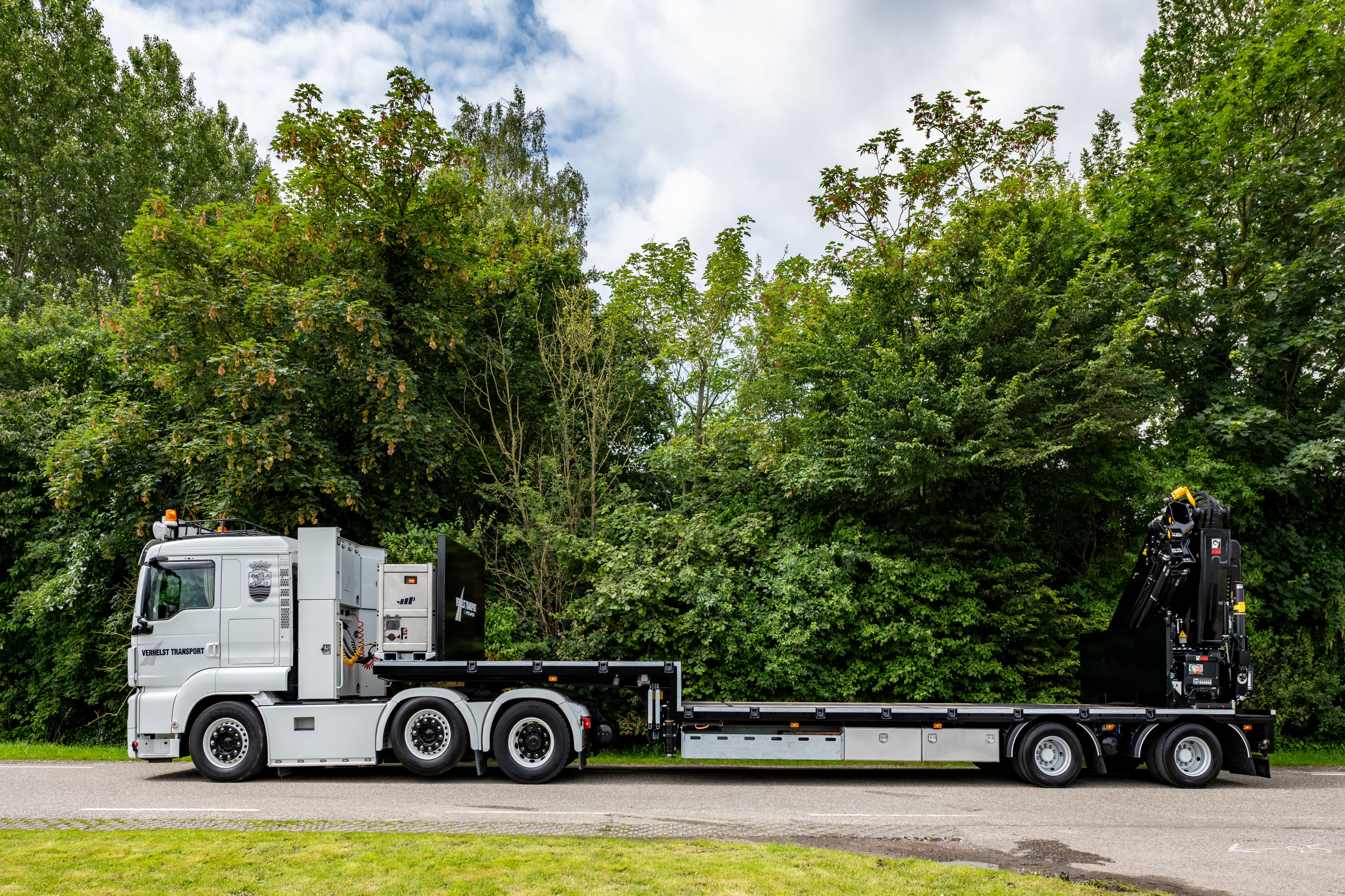 Oplegger voorzien van autolaadkraan 55 t/m volledig elektrisch